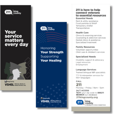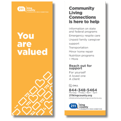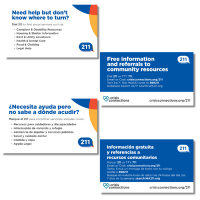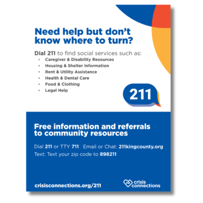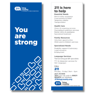Available in English or Spanish, the 211 info card is a quick reference for calling, texting, or chatting with information and referral specialists. Access information for yourself or others anytime and check out our online database: 211kingcounty.org.