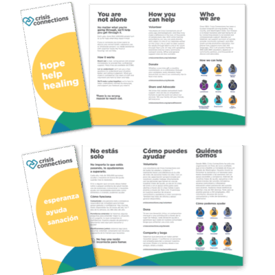 This resource guide for youth produced by Crisis Connections and Teen Link. WTTFT is available in English and Spanish. Download the PDFs below. Please also visit search.teenlink.org to explore services and support for teens.