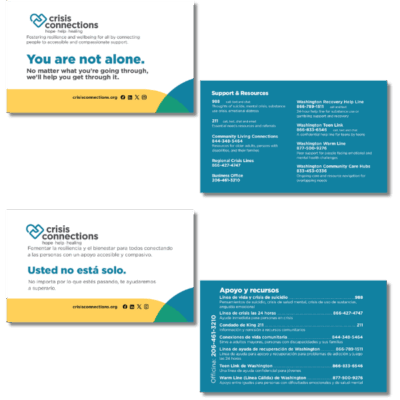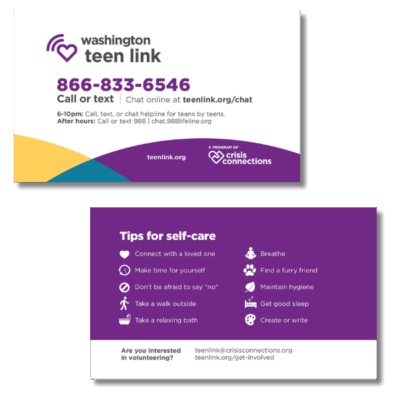 Useful for teens, adults, and professionals, the info card has call, text, and chat info readily available on the front and tips for self-care listed on the back.