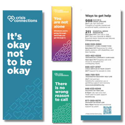 Our bookmarks serve up affirmations and valuable information for people to get help for mental and emotional health concerns, essential resources, peer connections, and assistance navigating overlapping needs.