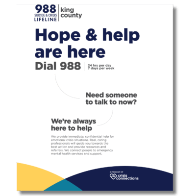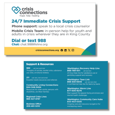 The 24/7 crisis support and Mobile Crisis Team info card provides essential contact information for 24/7 crisis support services in King County. It serves as a quick reference for individuals seeking immediate assistance, featuring the 988 crisis helpline for connecting with local crisis counselors.