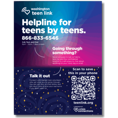 Get the word out to youth and professionals about Teen Link. This easy-to-read flyer doubles as a poster and has information for calling, texting, chatting, and our online database: search.teenlink.org.