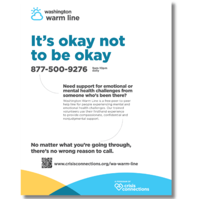 Remind folks it's okay not to be okay with this 8.5x11 Warm Line flyer that can also be used as a poster. Share the Warm Line phone number, hours, and quick access to the program webpage in your office, community center, or at events.